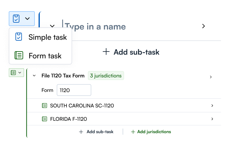 Ability to add a range of tasks such as: milestones that trigger invoices, form tasks that allows you add jurisdictions with due dates, or even call an API webhook that allows you to supercharge your workflows even more