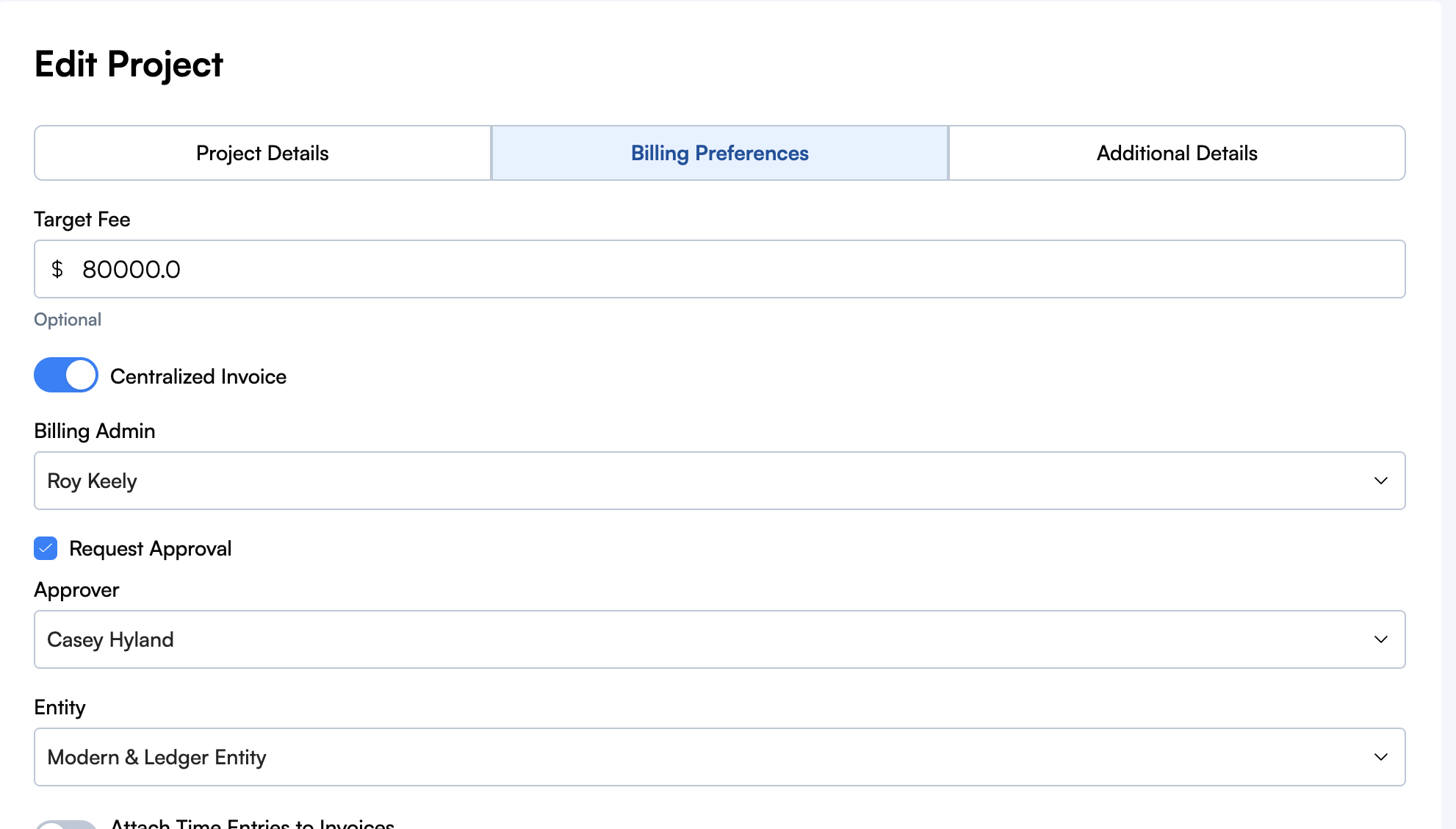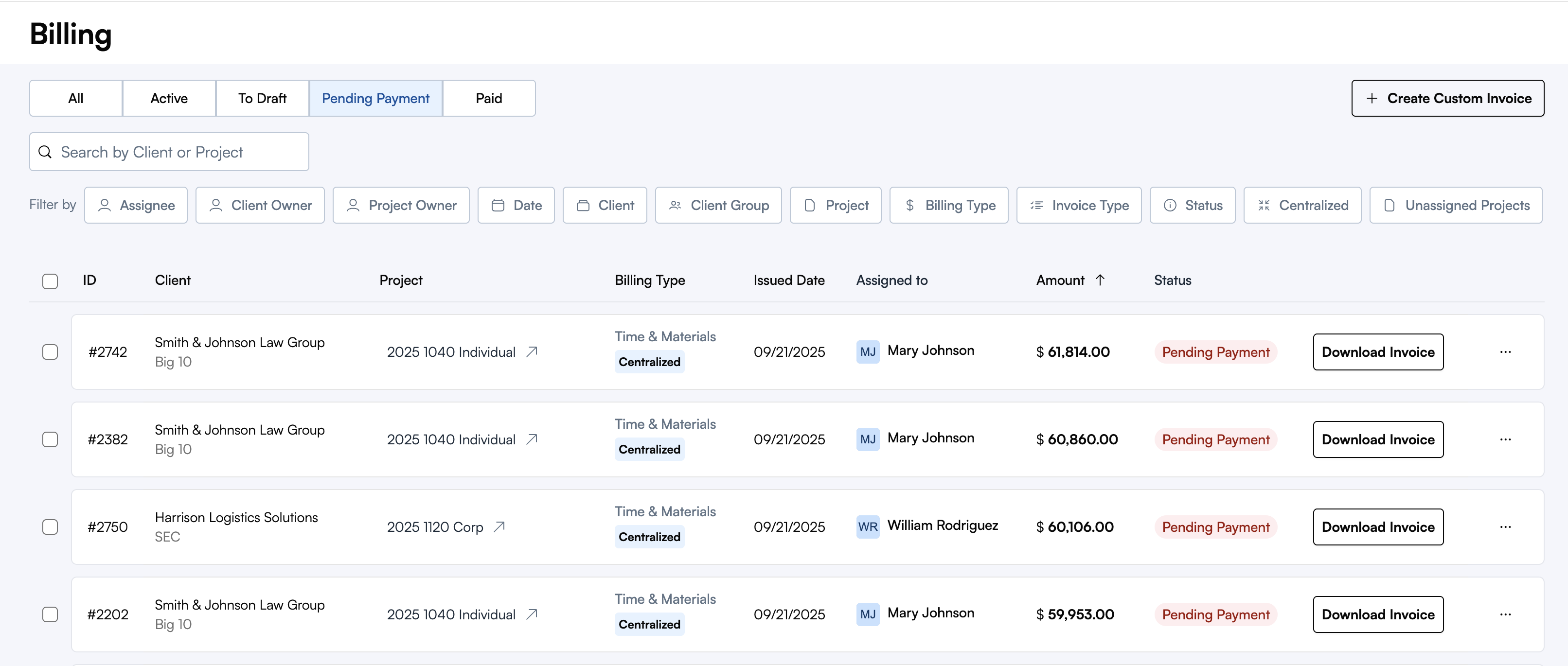 From the moment a client and project are created, an invoice is already waiting. Populate it automatically with target fees, WIP, or any parameters you set—fast cash flow without the busywork.